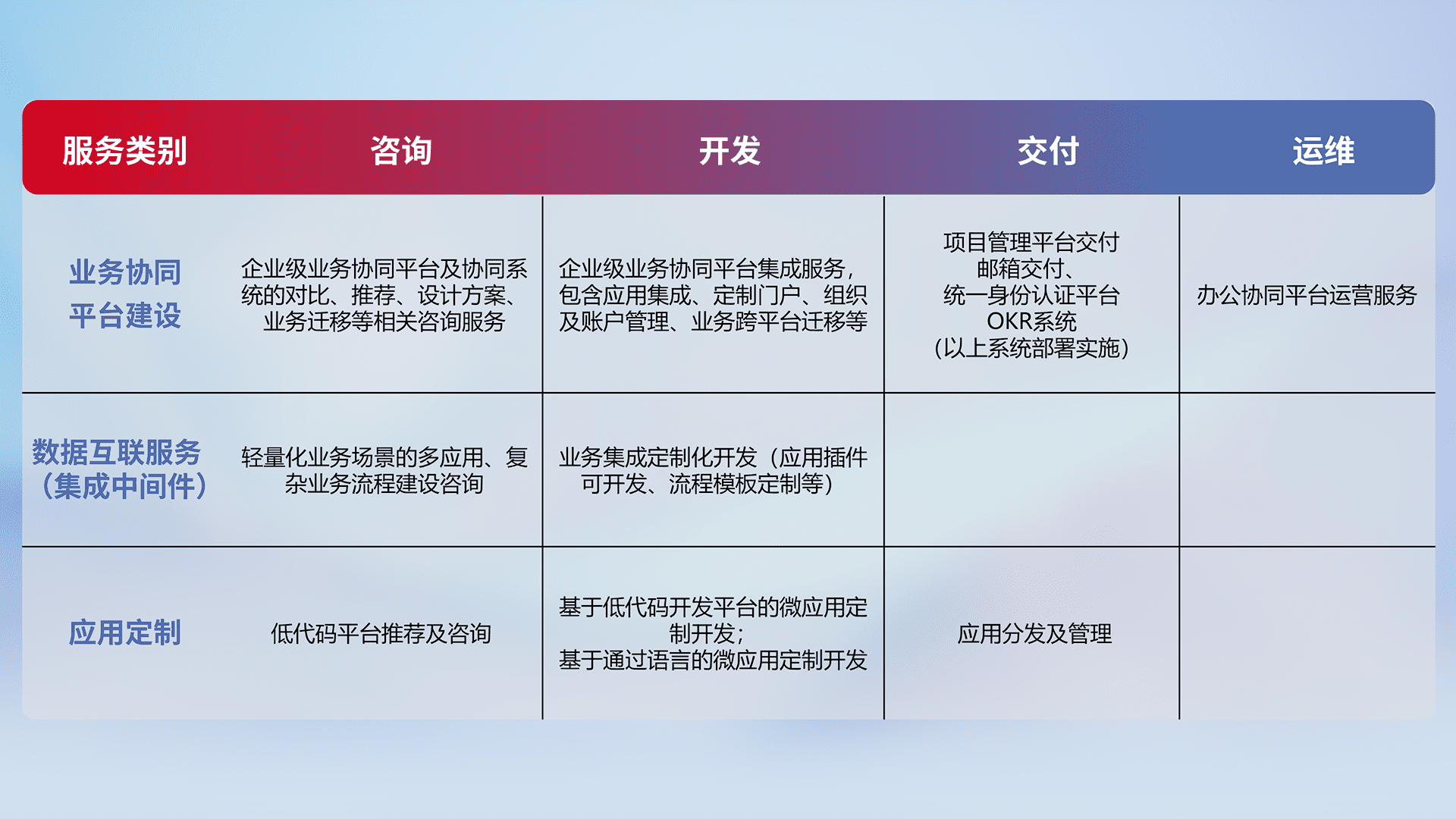 针对钉钉、、企微、、IDaas等平台级产品提供产品的规划、、、、方案、、、交付、、、定制化开发等服务,,,,实现如统一协同办公、、、智能客户服务、、混合会议管理、、智能数据查询、、、、等业务场景,,实现数字化转型。。。。