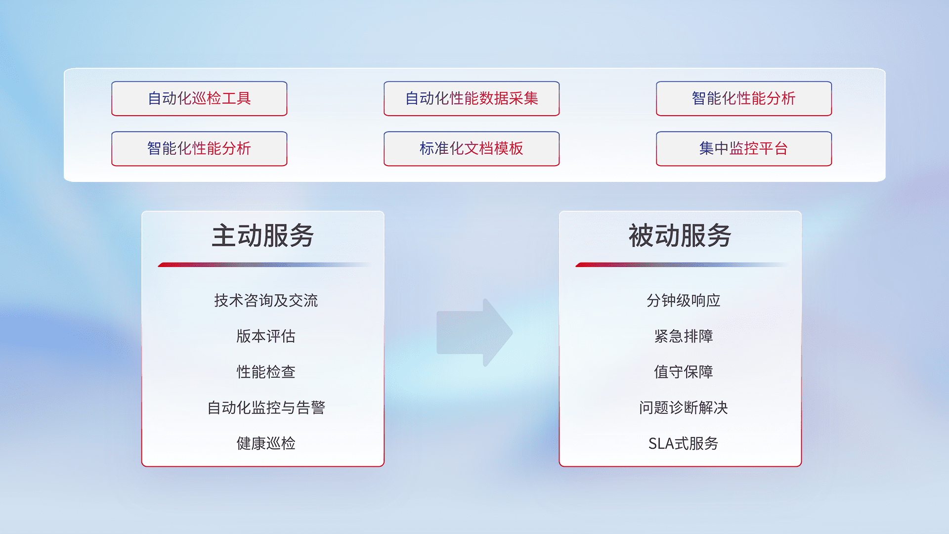 智能化工具和标准化文档,,,保障服务质量,,提供主动服务(包含技术咨询、、、版本评估、、、、性能检查、、、自动化监控与告警、、、健康巡检)和被动服务包含(分钟级响应、、、、紧急排障、、值守保障、、问题诊断解决、、、、SLA服务)。。。。